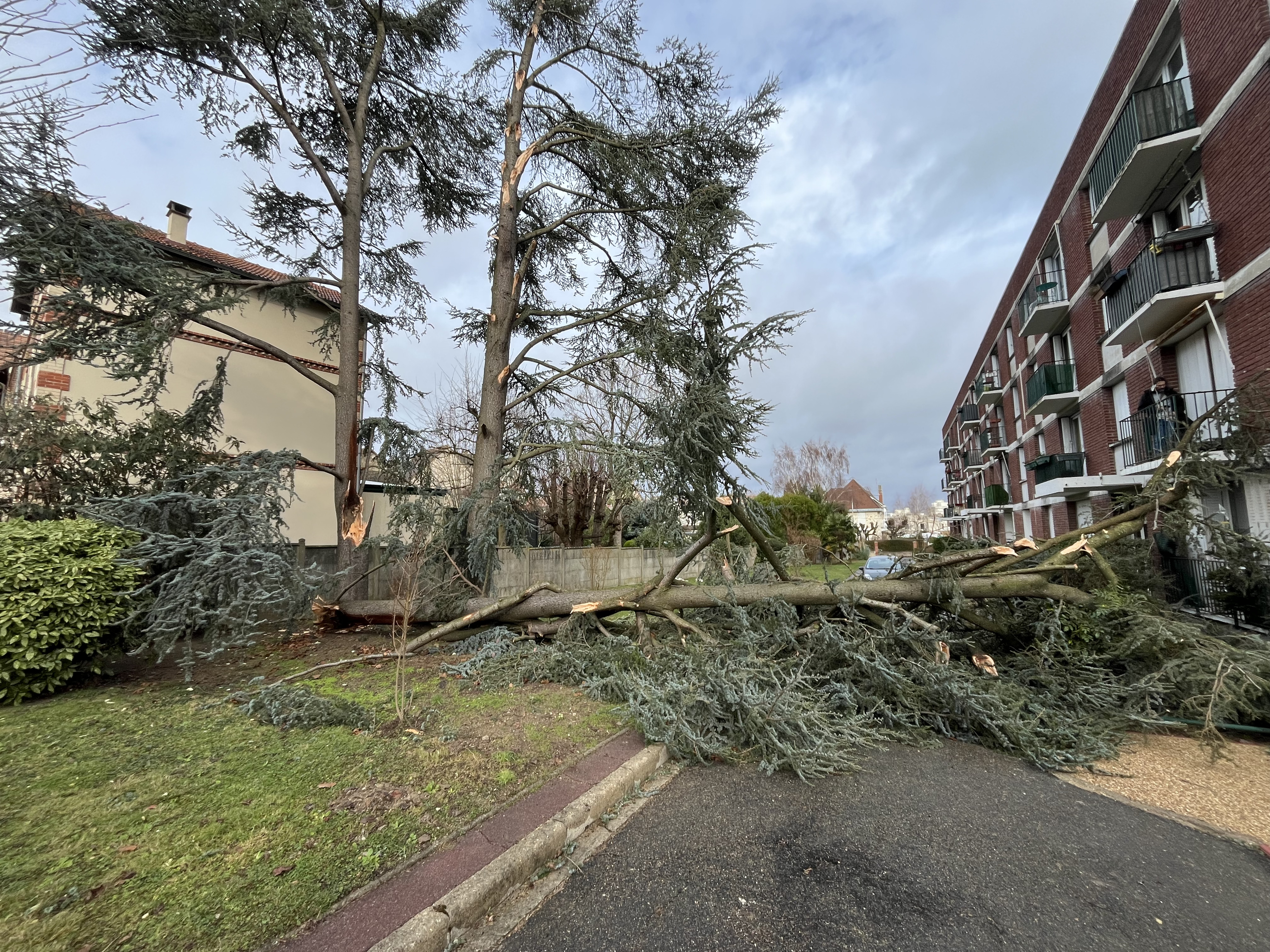 arbre couché sur une allée dans une résidence, bloquant le chemin, et mettant en danger certains habitants.